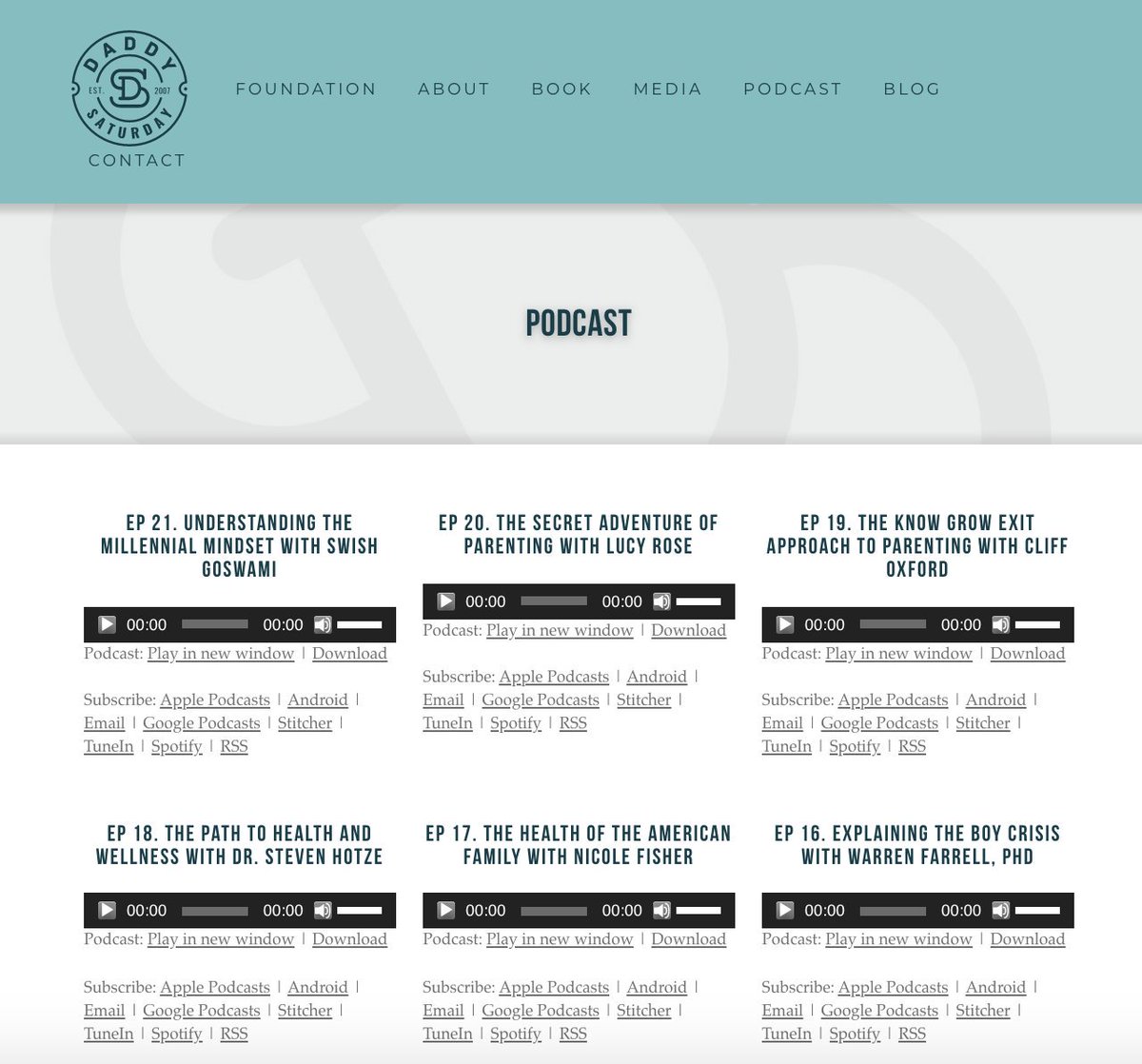 The statement is promotional in nature, encouraging people to stay updated with a podcast series that focuses on fatherhood, career, and self-awareness. The tone is inviting and informative, aiming to engage an audience interested in parenting topics. The image shows a webpage with a list of podcast episodes, which aligns with the content of the statement. There is no indication of harm, disrespect, or inappropriate content in the statement or the image.