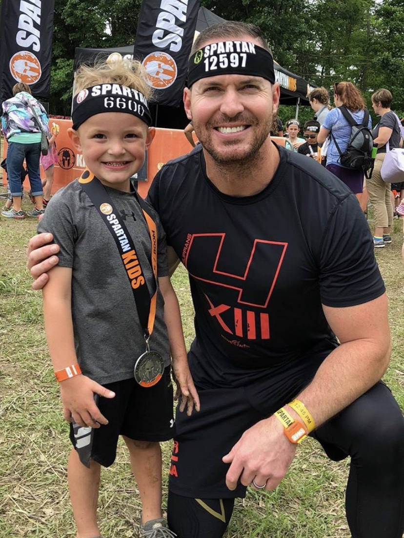 The statement uses metaphorical language to emphasize the importance of active and engaged fatherhood. It frames fatherhood as a serious commitment that requires effort and dedication, likening it to a 'battleground' where fathers must 'fight' for various aspects of family life. The image shows a smiling adult and child, presumably after participating in a Spartan race, which aligns with the message of overcoming challenges. The call to action encourages fathers to get involved and also promotes a book, suggesting it as a resource for fathers.