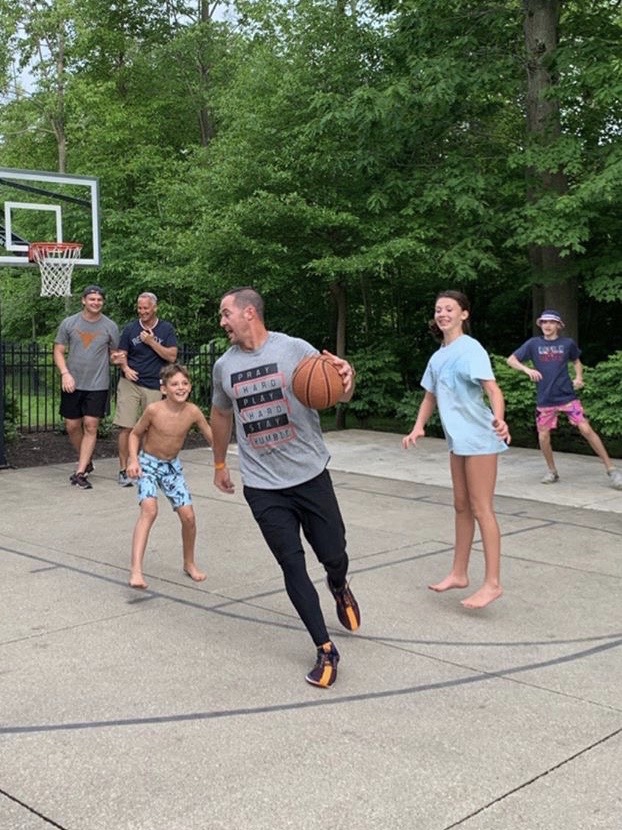 The statement is positive and encouraging, promoting the idea of being present and engaged with one's children instead of being distracted by technology. It serves as a reminder and a call to action for parents to prioritize quality time with their family. The accompanying image shows a group of people, including adults and children, playing basketball and enjoying each other's company, which visually reinforces the message of the statement.
