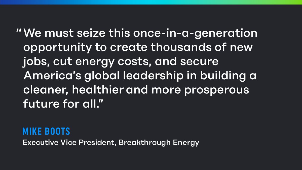 The statement 'Now, we need Congress to act quickly. I’m optimistic the U.S. can deliver on a clean energy future, but there’s no time to waste.' is a call to action regarding climate policy. It expresses urgency and optimism about the potential for progress in clean energy initiatives. The tone is constructive and forward-looking, encouraging swift legislative action. The image contains a quote from Mike Boots, Executive Vice President of Breakthrough Energy, emphasizing the potential benefits of seizing the opportunity for clean energy, including job creation, reduced energy costs, and global leadership. The image supports the statement by providing a positive outlook on the impact of clean energy policy.
