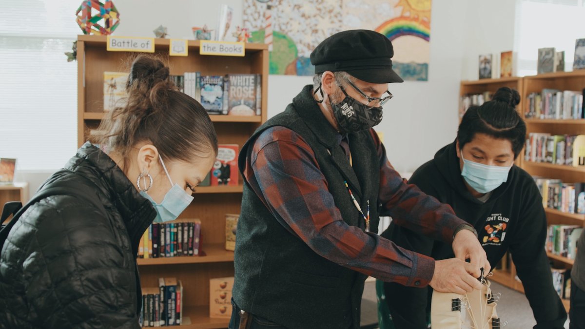 The statement is positive and supportive, expressing admiration for an individual named Jerad's efforts to help Native students. It promotes cultural engagement and the development of talents, which is encouraging and uplifting. The image accompanying the statement shows a person, presumably Jerad, interacting with students in a library setting, which visually supports the message of involvement and education.