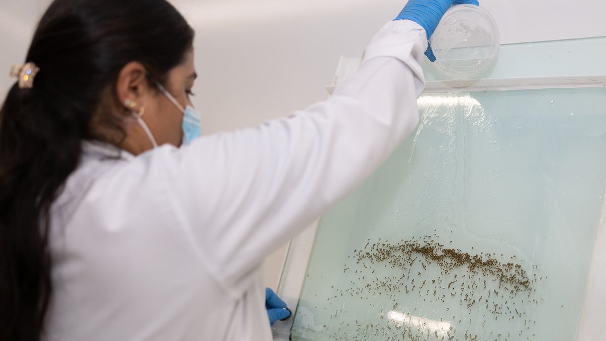 The statement describes a scientific endeavor in Medellín, Colombia, where scientists are breeding mosquitoes, presumably for research purposes. The tone is neutral and informative, providing context for the image of a scientist working with mosquitoes. The accompanying link to a website with a title and description suggests a focus on innovative strategies to combat mosquito-borne illnesses, highlighting the work of Dr. Damaris Matoke-Muhia in fighting malaria. The statement and image together convey information about scientific research aimed at public health improvement.