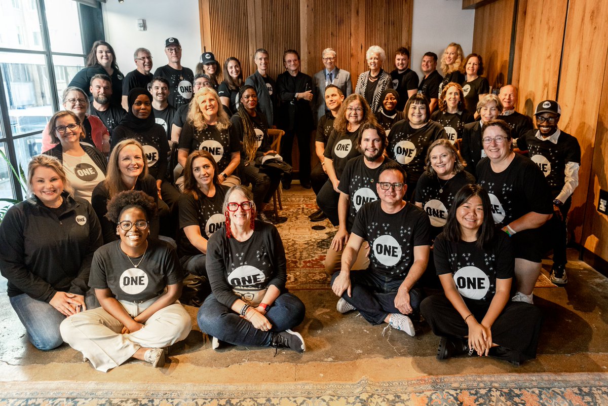 The statement is positive and celebratory, highlighting a moment of surprise and engagement with activists. It mentions a photobomb event with Bono and activists from ONE in America, discussing their campaign stories and progress in malaria research. The tone is upbeat and supportive of the cause, and the content promotes awareness of the Global Fund campaign and malaria research efforts. The accompanying image shows a group of people, presumably the activists, together with Bono, smiling and wearing campaign t-shirts, which reinforces the message of unity and support for the cause.