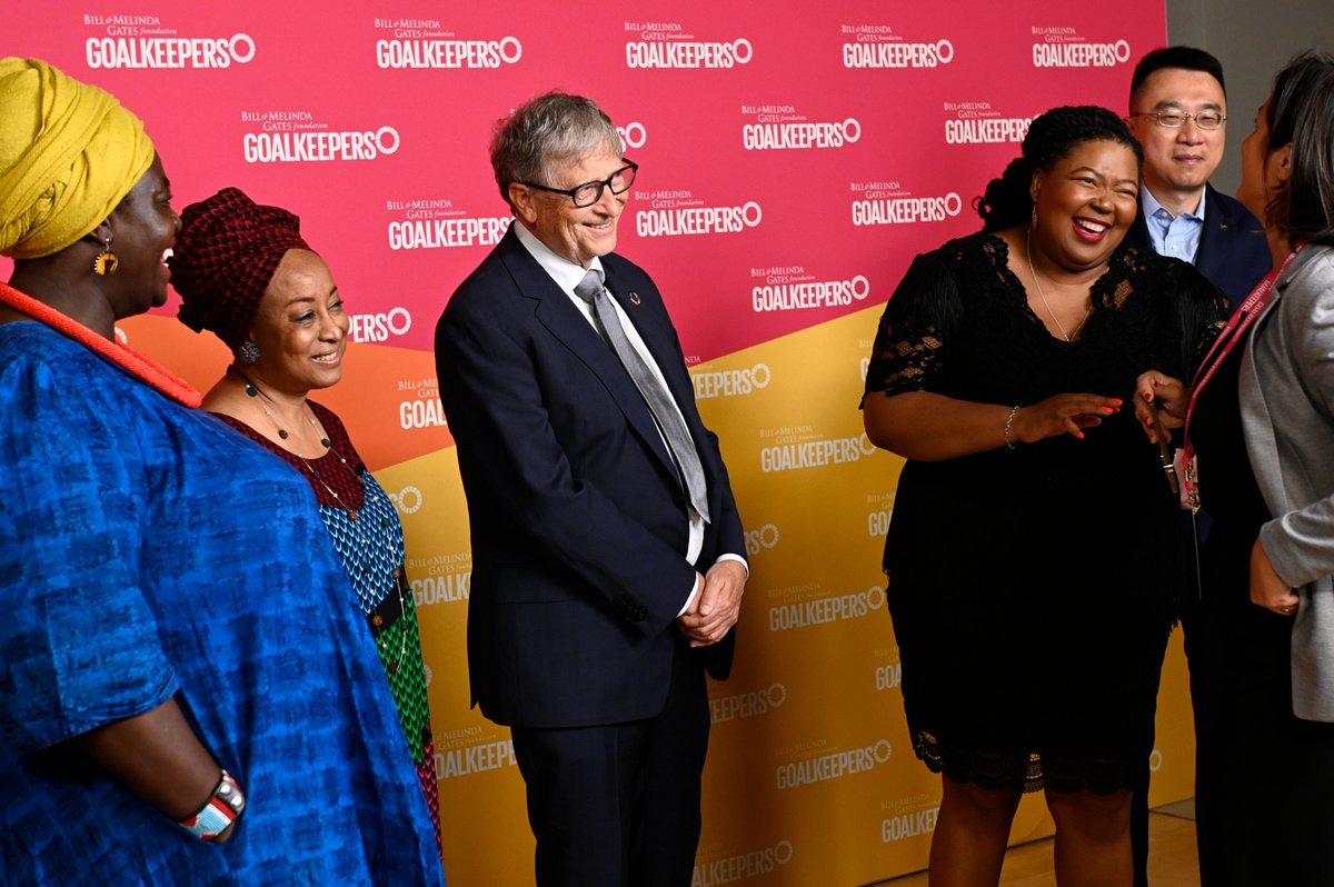 The statement is positive and celebratory, expressing admiration for the individuals present at the event. The hashtag #Goalkeepers2030 suggests a connection to a campaign or initiative focused on future goals, likely related to social or global development. The images depict a group of individuals at an event, smiling and engaging with each other, which supports the positive tone of the statement.