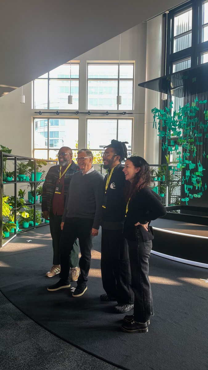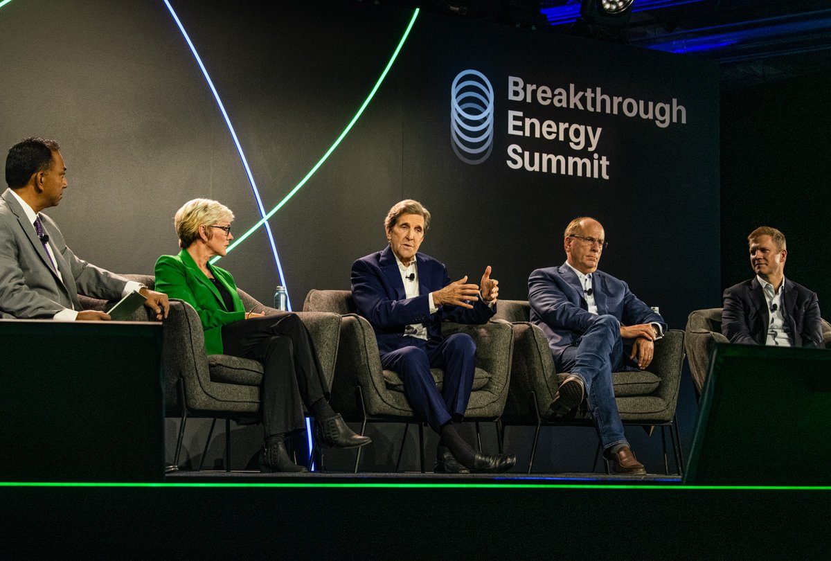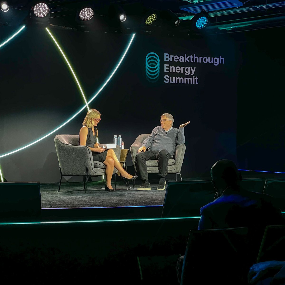 The statement is positive and forward-looking, expressing hope and a commitment to addressing climate change by reaching net-zero emissions. It acknowledges the difficulty of the task but ends on an optimistic note. The accompanying image shows a person speaking at the Breakthrough Energy Summit, which is relevant to the context of the statement. The conversation thread includes various replies and images that highlight collaboration, innovation, and progress in the field of sustainable energy, which aligns with the overall message of optimism and action towards a common goal.
