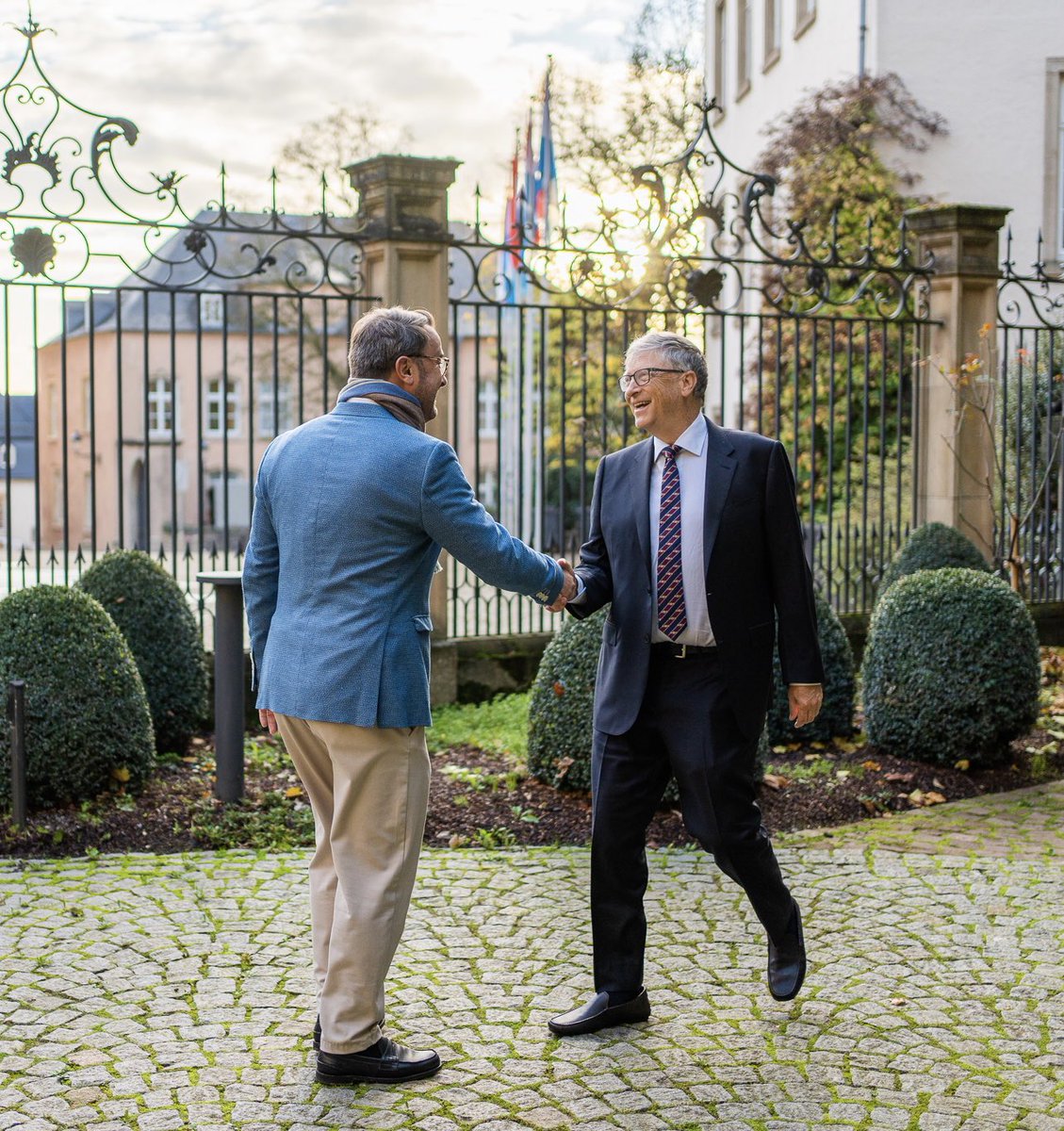 The statement expresses gratitude and acknowledges the commitment and support of Prime Minister Xavier Bettel. It is a positive and respectful acknowledgment of a conversation about shared priorities and important global issues. The images show two individuals in a friendly handshake and a group of people in a meeting, which visually supports the constructive nature of the conversation mentioned.