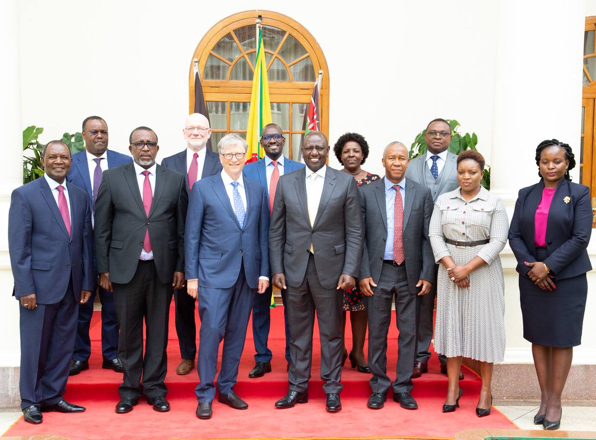 The statement 'Thank you for having me. I’m excited to be here in Kenya this week to see how much progress has been made.' is a positive and respectful expression of gratitude and interest in the progress of a country. It is a part of a conversation acknowledging the support provided by an organization to Kenya in various sectors. The image shows a group of individuals, presumably including the speaker and representatives of the organization mentioned, posing together, which suggests a formal meeting or event. The tone of the statement is appreciative and forward-looking, and it does not contain any harmful or disrespectful content.
