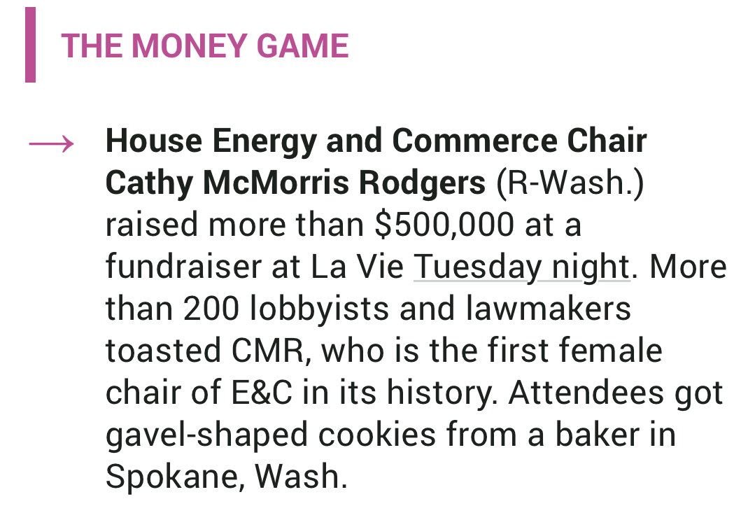 The statement criticizes the influence of money in politics, suggesting that corporations disproportionately influence lawmakers through financial contributions, while the interests of average Americans are neglected. The tone is one of frustration and disapproval of the current political system. The accompanying image provides context by highlighting a specific fundraising event where a significant amount of money was raised, and the mention of gavel-shaped cookies adds a metaphorical touch to the critique of the 'money game' in politics.