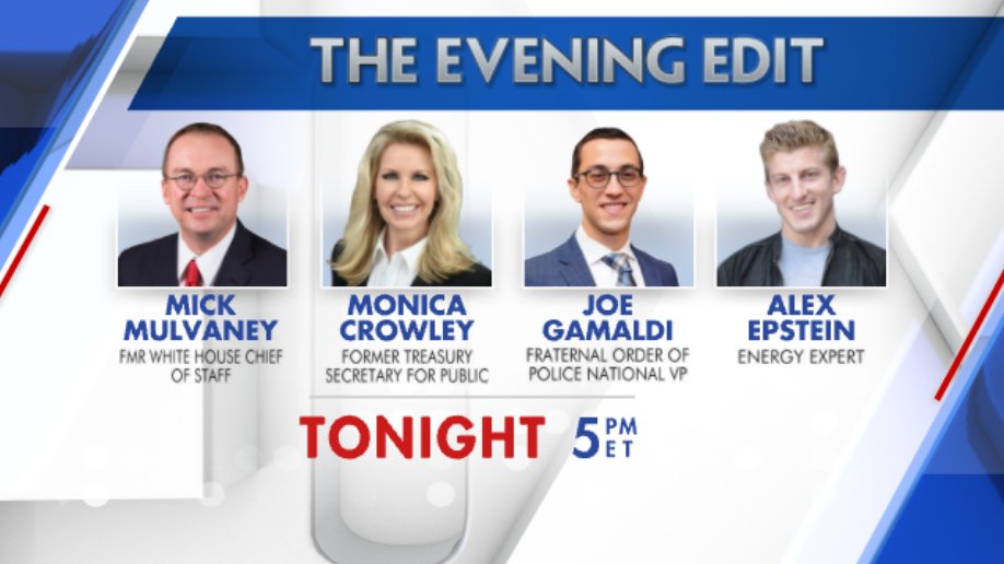 The statement is a promotional announcement for a television program, 'The Evening Edit,' listing the guests who will appear on the show. It is informational and neutral in tone, intended to inform viewers about the upcoming episode and its participants. The images provided are standard promotional graphics for television programming, displaying the names and affiliations of the guests.