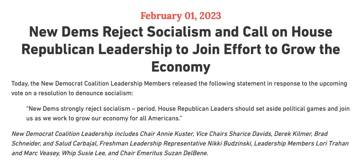 The statement is a political message from a group identified as 'New Dems' expressing their stance against socialism and calling for bipartisan cooperation to grow the economy. The tone is assertive and aims to clarify their position while inviting another political group to collaborate. The image contains text that mirrors the statement's content.