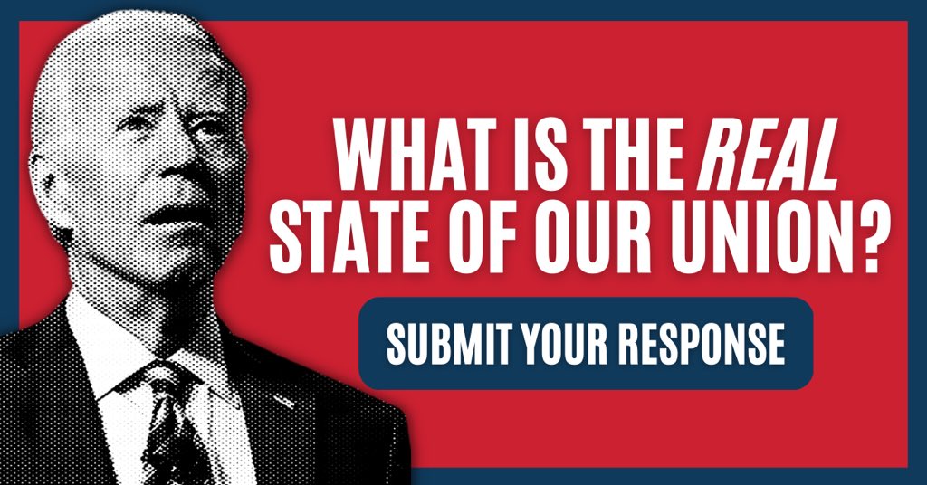 The statement is a critique of the current state of affairs and a call for political change, specifically advocating for conservative leadership. It references economic concerns such as inflation and the financial struggles of Americans. The image accompanying the text features a stylized representation of a political figure with text encouraging viewers to submit their response about the state of the union, which suggests an invitation for public discourse.