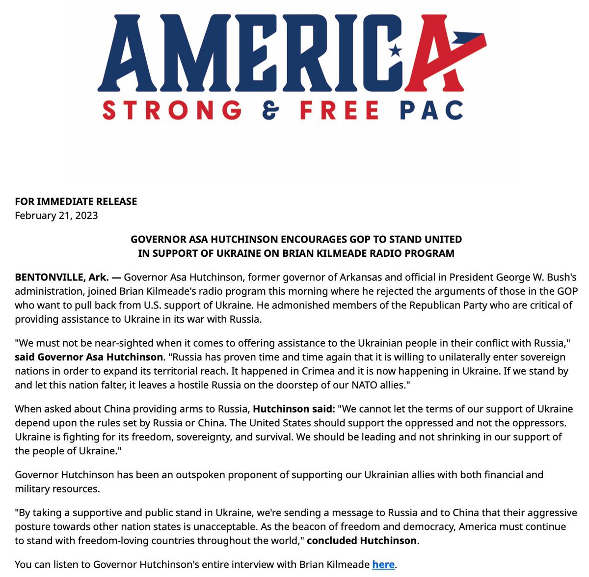 The statement is a press release from Governor Asa Hutchinson encouraging members of the Republican Party to support Ukraine. The tone is serious and political, with an intent to persuade and unify members of the GOP around the issue of supporting Ukraine against Russian aggression. The content focuses on the importance of standing with Ukraine for its freedom, sovereignty, and survival, and warns against the consequences of a hostile Russia near NATO allies.