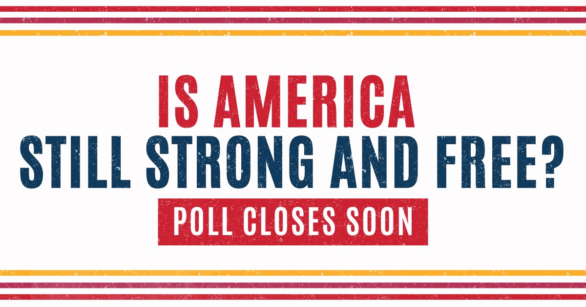 The statement is a call to participate in a poll regarding the current state of America, asking whether it is 'STILL strong and free' or if there is 'work to do.' The tone is engaging and encourages participation in a democratic process. The image accompanying the text reinforces the message of the poll with a patriotic design.