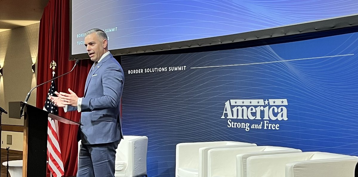The statement is positive and complimentary, expressing honor and inspiration from @RepCiscomani's story and thanking him for his presence at the #BorderSolutionsSummit. The images show a person speaking at a podium with the event's branding, which supports the context of the statement. The tone is respectful and acknowledges the individual's achievements and contributions to the event.