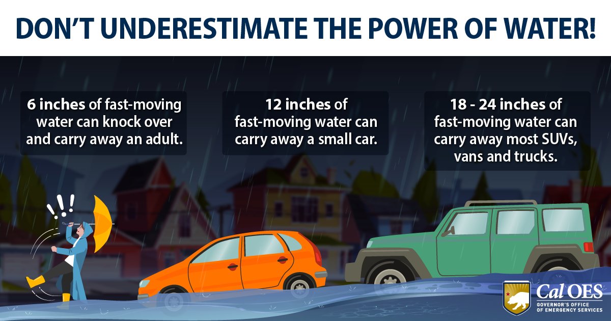 The statement, accompanied by an informative image, serves as a public safety announcement regarding the dangers of flood waters during an atmospheric river event in California. The tone is cautionary and informative, aiming to educate the public on the risks associated with fast-moving water and to advise on safety measures such as avoiding unnecessary travel and respecting road closures. The image reinforces the message by visually depicting the potential hazards to individuals and vehicles of different sizes in flood conditions.