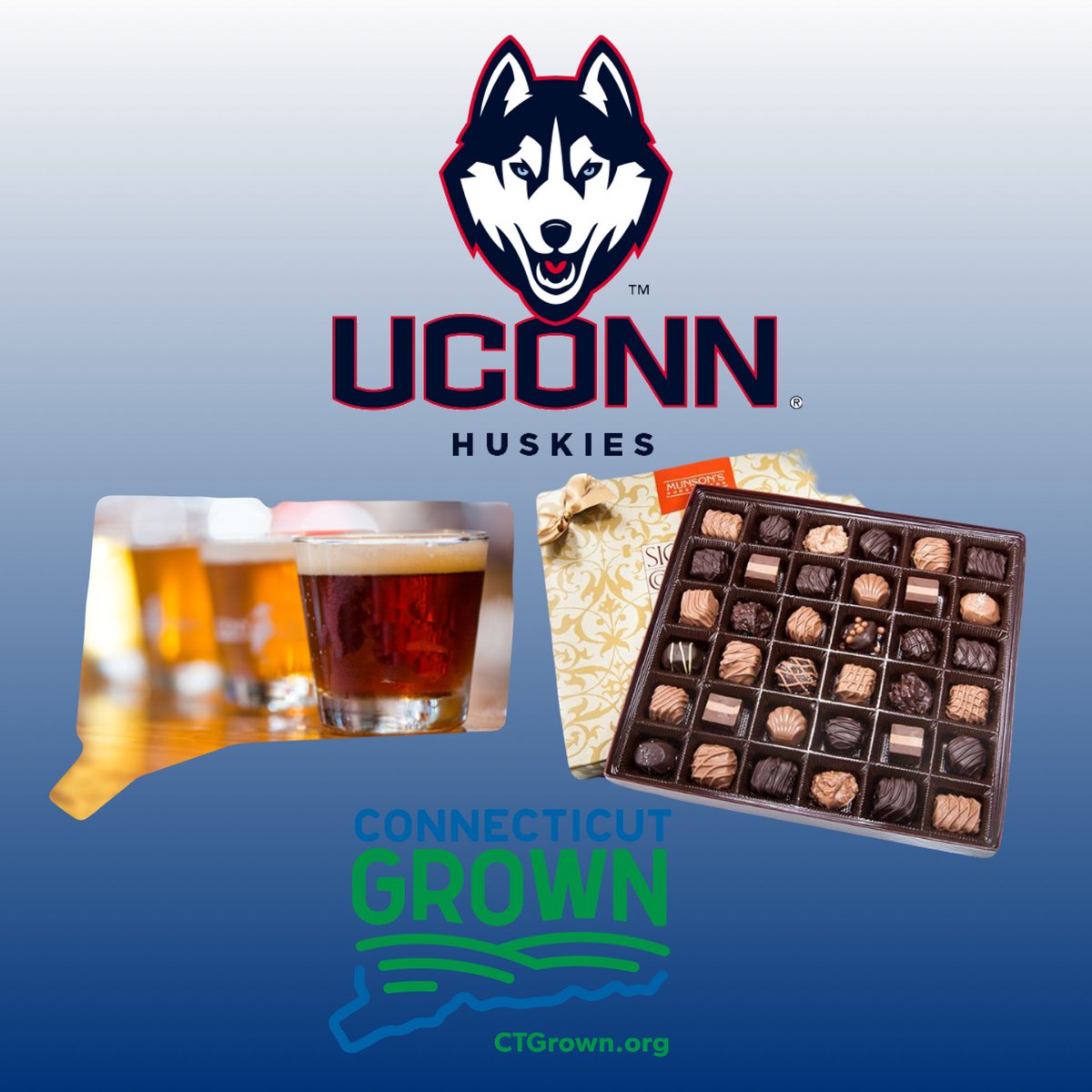The statement is a friendly and lighthearted response to a proposed wager between two public figures, likely governors, over a sports event. The tone is competitive but in good spirits, and the content involves a bet of local products from their respective states. The image shows products associated with the University of Connecticut, suggesting pride in local goods and support for a local sports team.