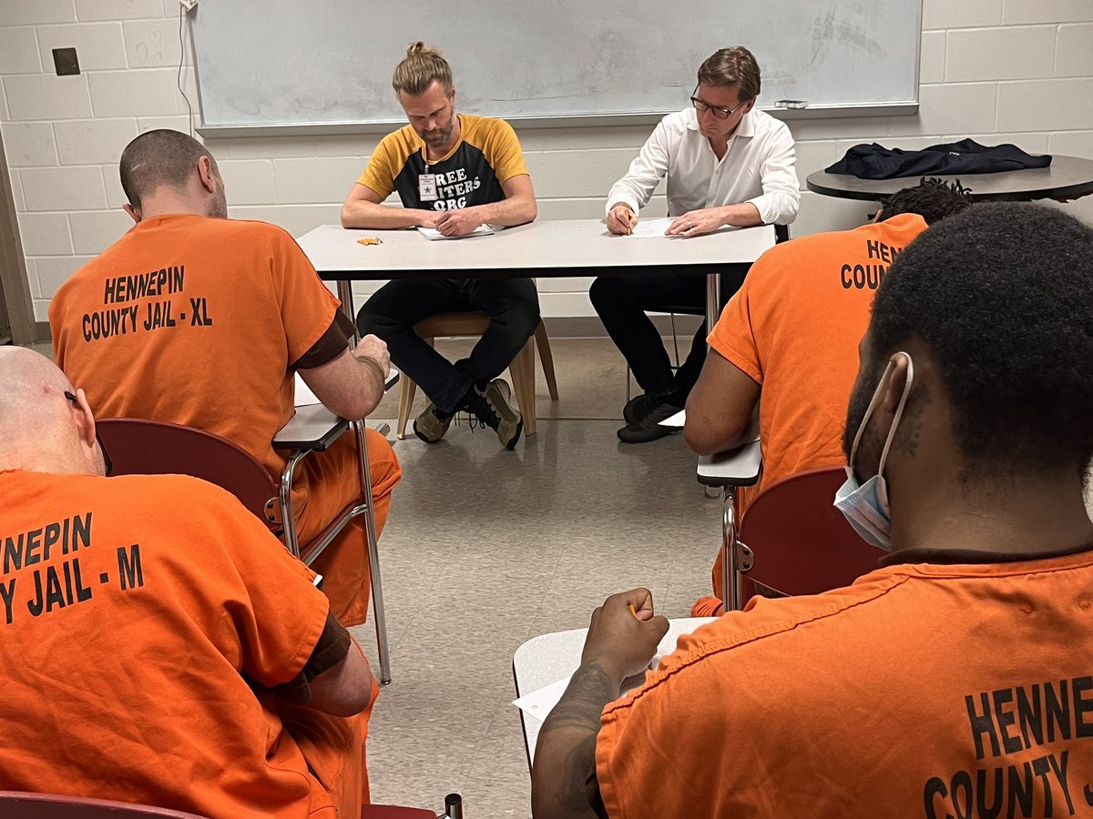 The statement is positive and appreciative, highlighting the value of a creative writing program in a correctional facility. It emphasizes the talent and potential of the participants and the program's impact. The images show individuals in a classroom setting, engaged in a writing session, and expressing enthusiasm. The website link suggests a platform related to the writing program, likely offering further information or support for the initiative.