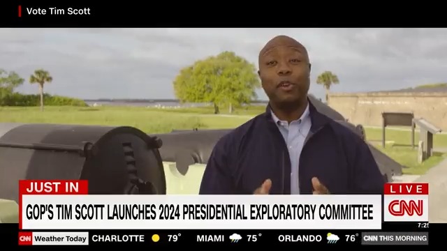 The statement is a factual report about a political figure, Sen. Tim Scott, taking a step towards a potential presidential campaign by launching an exploratory committee. The tone is neutral and informative, and the content is focused on a newsworthy event in the political landscape. The image accompanying the statement shows a screenshot from a news broadcast, which is relevant to the statement and provides visual context.
