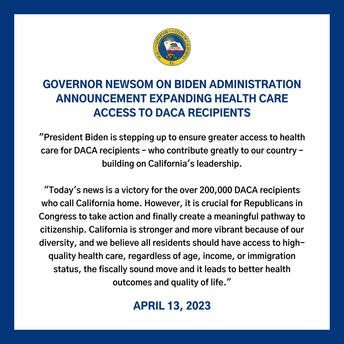 The statement is a positive endorsement of health care policy changes and expresses support for inclusive access to health care services. It acknowledges the contributions of DACA recipients and calls for bipartisan action in Congress. The tone is constructive and advocates for policy that benefits a specific group within society while also suggesting it is beneficial for the broader community.