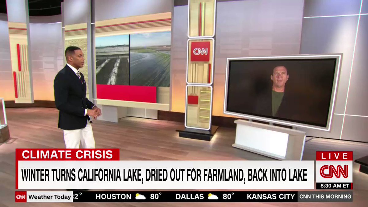 The statement is a factual report about the environmental change occurring at Tulare Lake in California, which is experiencing a resurgence of water levels due to a wet and snowy winter. The tone is informative and neutral, and the content is focused on delivering news about a climate-related event. The image shows a news anchor and a correspondent discussing the topic on a news program, which supports the context of the statement.