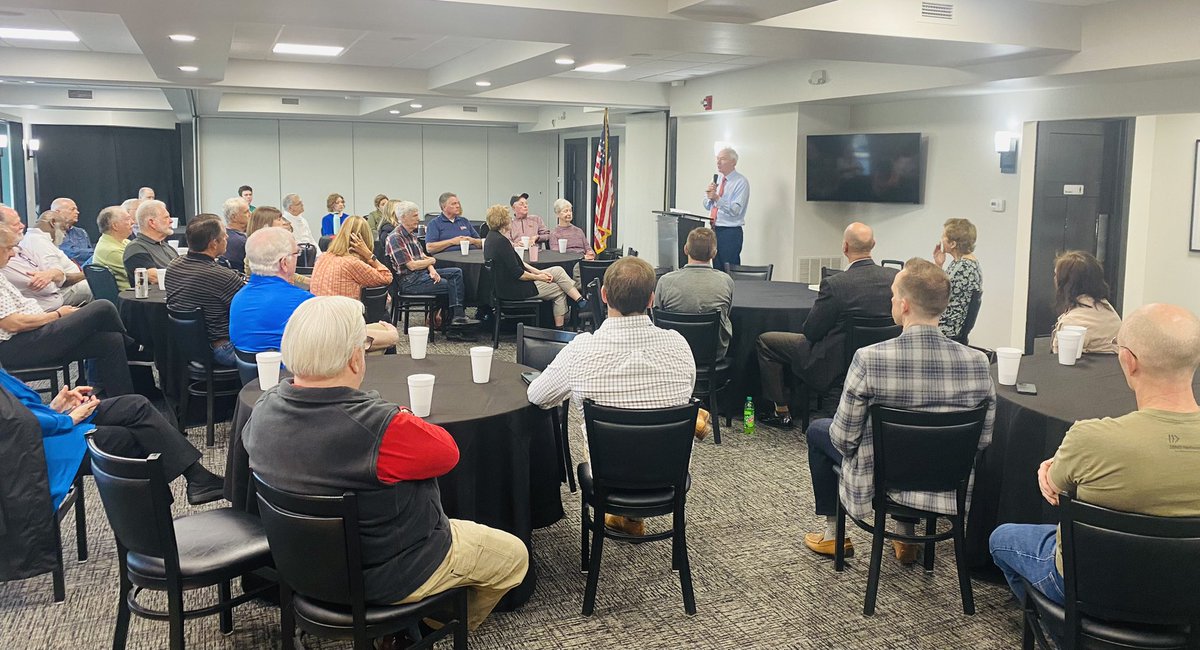 The statement is positive and expresses gratitude and optimism after a meeting with Iowans. It reflects a positive engagement with the community and does not contain any harmful or disrespectful content. The image shows a group of people attending a meeting with a speaker at the front, which aligns with the context provided by the statement.