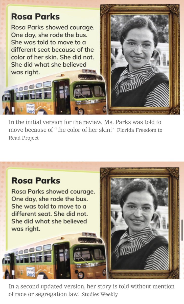 The statement is critical of a textbook publisher's interpretation of a law, suggesting that it led to the omission of important historical context regarding race in the story of Rosa Parks. The statement implies that such an interpretation may not be suitable for educational curriculum. The image shows two versions of how Rosa Parks' story is presented, with the first mentioning race and the second omitting it. The tone is one of concern and critique regarding educational content and the implications of censorship or alteration of historical facts.