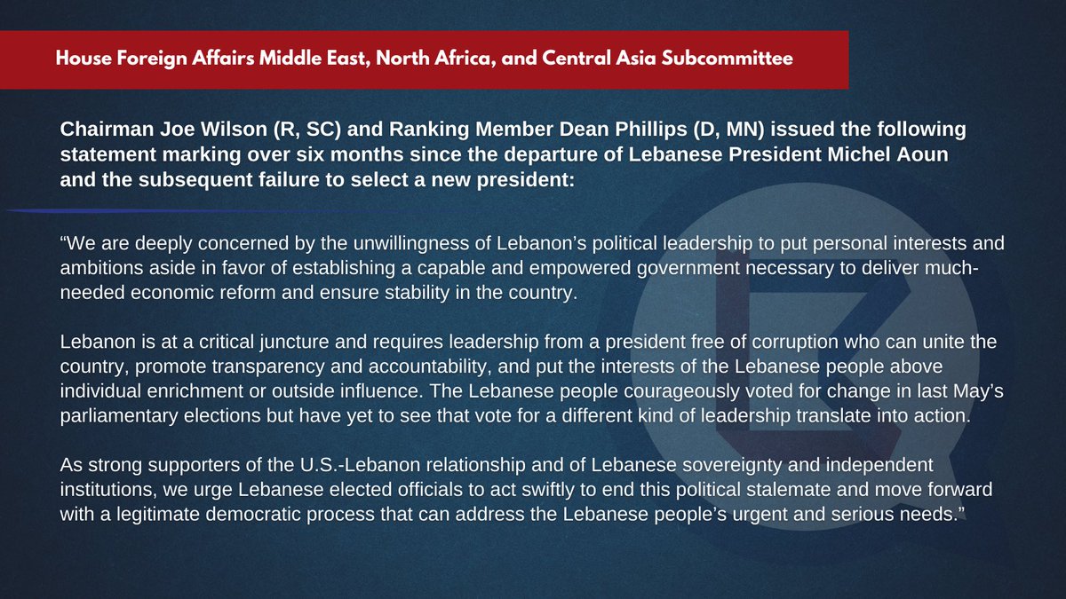 The statement is a formal political call to action, expressing concern over Lebanon's political situation and urging Lebanese leaders to prioritize the needs of their people by electing a new president. The tone is serious and focused on the importance of a stable and accountable government. The image contains text that aligns with the statement, reinforcing the message conveyed.