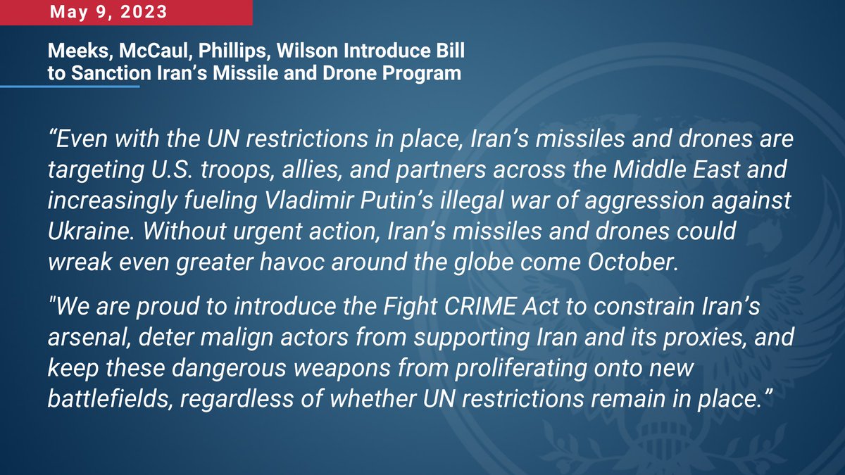 The statement is a political communication regarding the introduction of a bill, the Fight CRIME Act, aimed at imposing sanctions related to Iran's missile and drone program. The tone is serious and informative, with an intent to convey the urgency and rationale behind the proposed legislation. The content focuses on national security concerns and the prevention of the proliferation of weapons.
