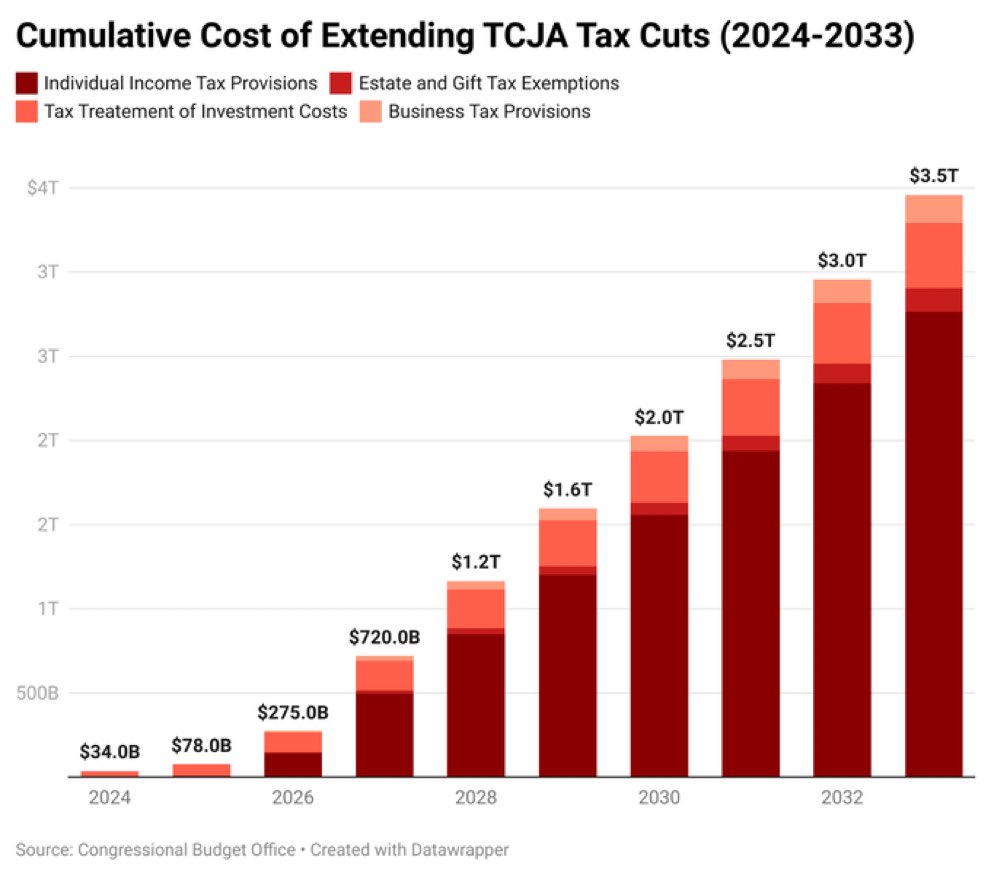 The statement presents a perspective on wealth distribution and tax policy in the United States, suggesting that the concentration of wealth among the top 1% could be leveraged to address national debt and deficit issues. It advocates for the reversal of the 2017 tax cuts, labeling them as a 'tax scam.' The accompanying image provides data on the projected cumulative cost of extending the Tax Cuts and Jobs Act (TCJA) tax cuts from 2024 to 2033, which supports the statement's argument about tax policy. The tone is critical and advocates for policy change.