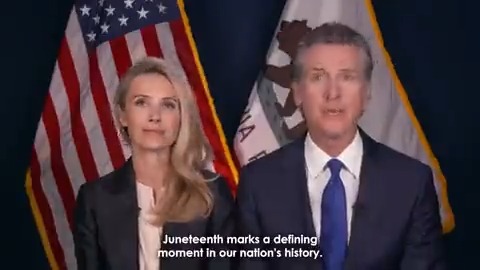 The statement recognizes Juneteenth as a significant historical event, emphasizing the importance of acknowledging the past to foster a more equitable future. It conveys a message of reflection and celebration, and the tone is respectful and forward-looking. The image accompanying the statement shows two individuals with the American and Californian flags in the background, which suggests a formal or official context, likely aligning with the message of the statement.