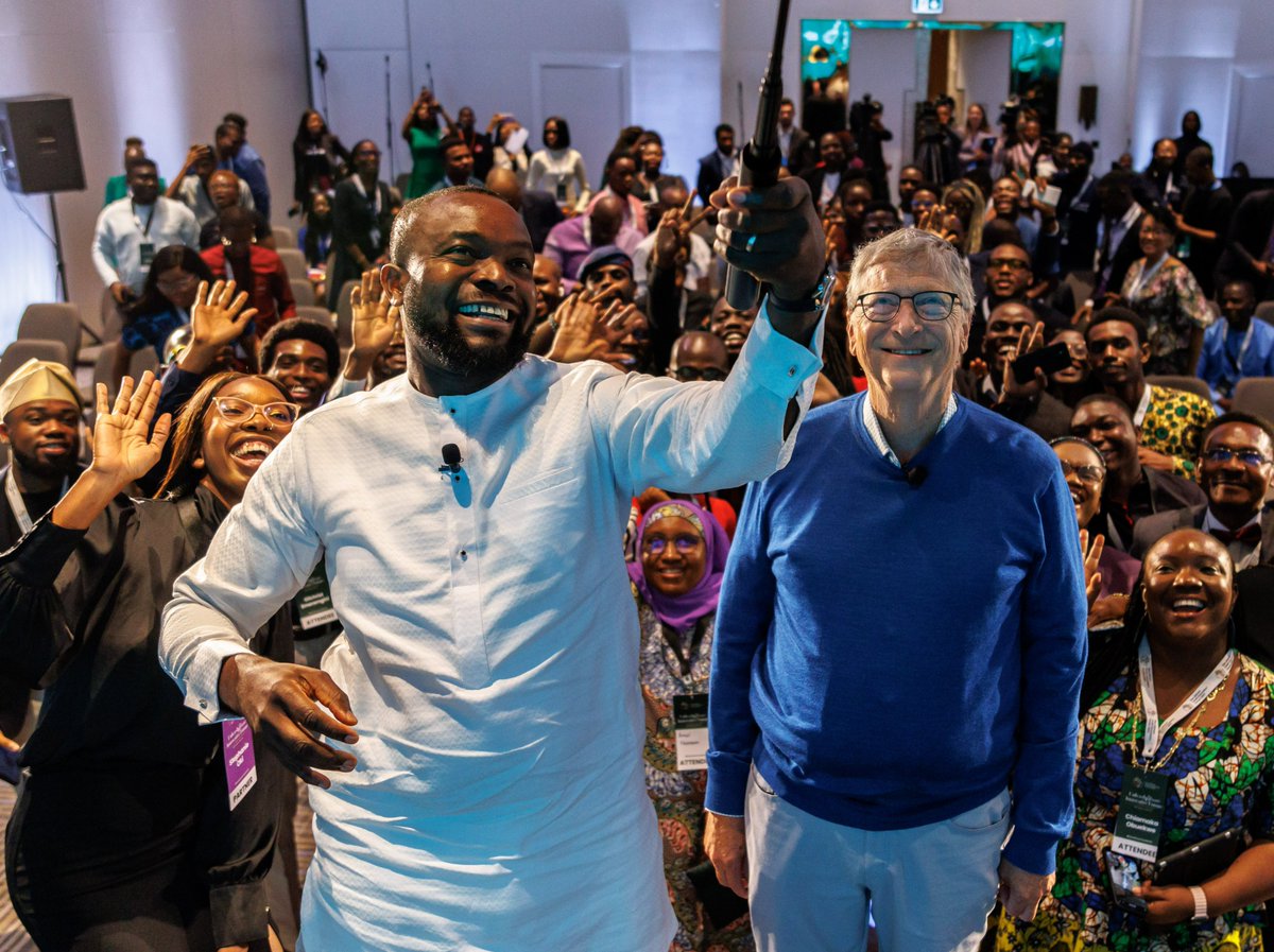 The statement expresses a positive sentiment towards the youth of Nigeria and their potential impact on the future through science and innovation. It encourages viewers to watch a conversation with young entrepreneurs, suggesting a focus on empowerment and constructive dialogue. The image depicts a group of people, presumably at the event, with a cheerful and engaged atmosphere. The associated website title and description indicate an event with Bill Gates discussing the role of science and innovation in advancing Africa, which aligns with the statement's message.