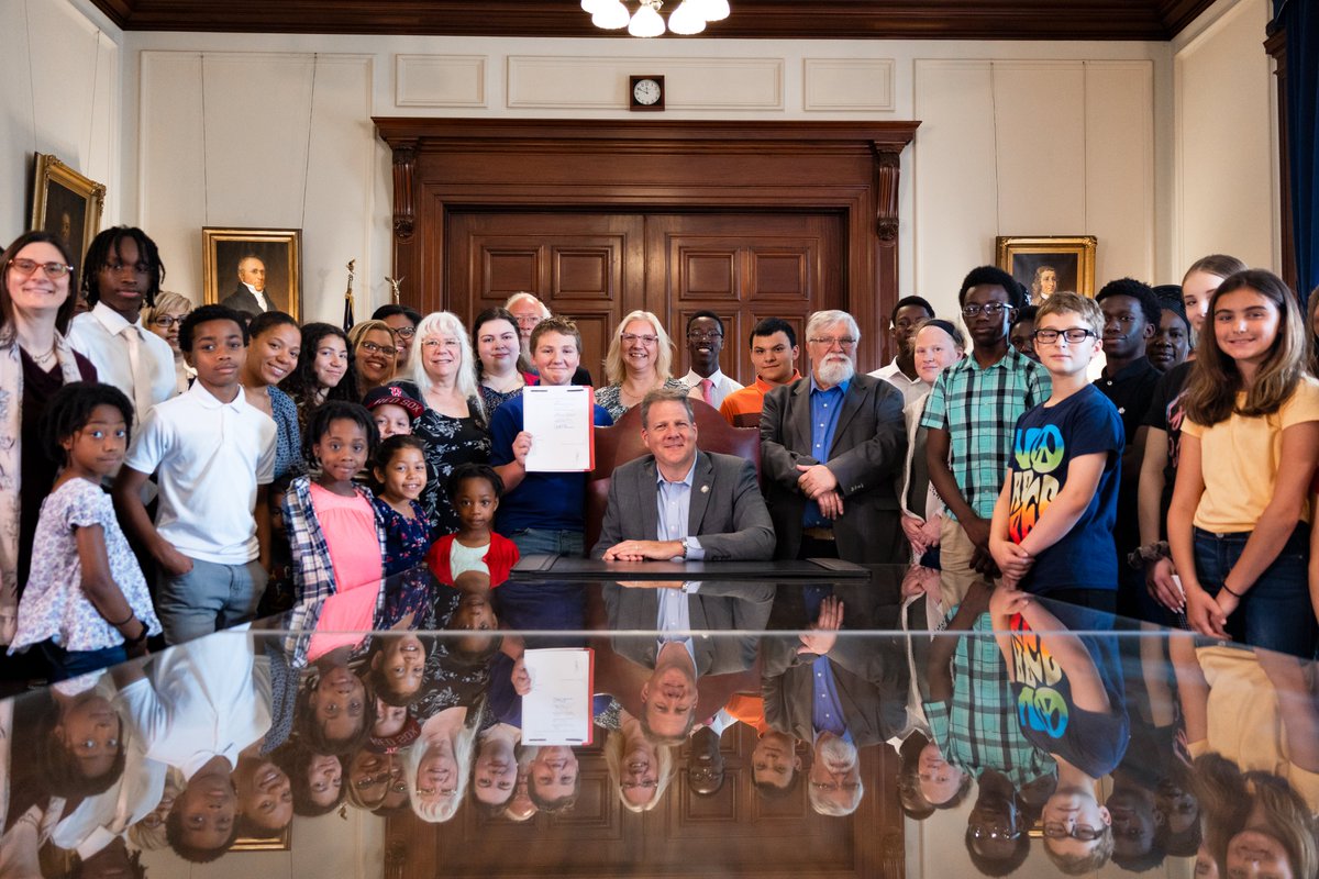 The statement is a positive acknowledgment of a policy decision related to education. It praises the efforts of Governor Chris Sununu and New Hampshire legislators for providing educational choices to students and parents. The tone is congratulatory and supportive of the policy, which is intended to promote educational freedom and accessibility. The image shows a group of people, presumably including students, parents, and officials, gathered around a desk with Governor Sununu, suggesting a ceremonial signing of legislation. The image supports the statement by visually representing the success and communal support of the legislation.