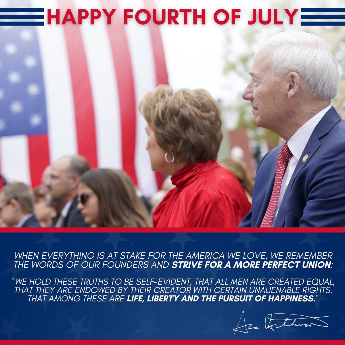 The statement 'I am proud to be an American! Happy Independence Day!' is a positive expression of national pride and well-wishing on a national holiday. The accompanying image features a patriotic display with the American flag and a quote about striving for a more perfect union, reflecting the values of the United States. The tone is celebratory and inclusive, and the content promotes national unity and remembrance of foundational values.
