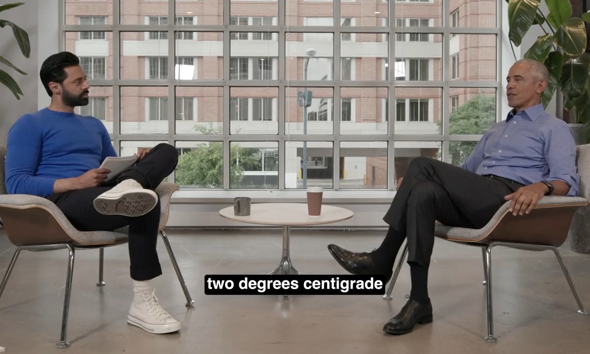 The statement invites viewers to watch a conversation with Hasan Minhaj and a prominent figure, discussing topics such as democracy and hope. The tone is informative and engaging, aiming to promote a dialogue on important issues. The linked website title, however, uses a sensationalist approach by highlighting a question about depression, which could be seen as trivializing a serious topic for clickbait. The conversation snippet from @BarackObama provides context for the type of discussions being held, focusing on progress and making a difference. The image shows two individuals engaged in a conversation, which is relevant to the context of the discussion being promoted.