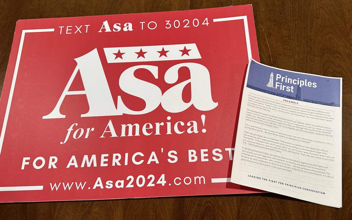 The statement and the conversation appear to be part of a political discussion, emphasizing the importance of principles and the country's well-being over political maneuvering. The tone is positive and constructive, focusing on the idea of putting the country's interests first and acknowledging challenges while maintaining an optimistic outlook. The image shows promotional materials for a political figure and a document titled 'Principles First,' which seems to align with the theme of the conversation about principled leadership.