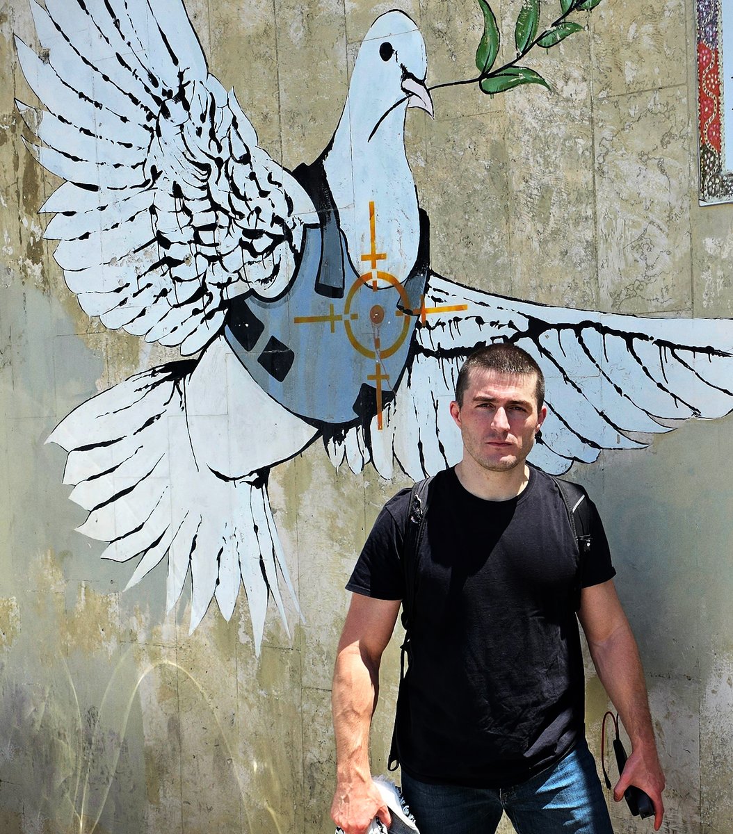 The statement is informative and reflective, sharing the individual's personal experience of engaging with Palestinians in the West Bank. It conveys a sense of empathy and a desire to share the perspectives of those he spoke with. The tone is neutral and suggests a commitment to sharing stories that may foster understanding. The accompanying image shows a person standing in front of a mural of a dove, which is often a symbol of peace, adding a visual element of hope to the narrative.