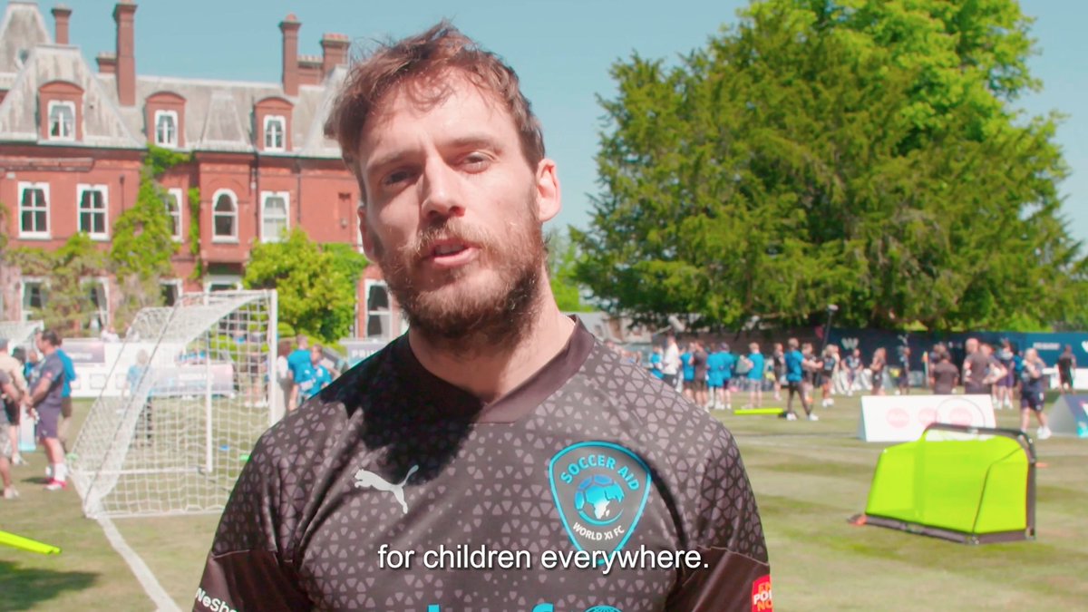 The statement is positive and supportive, expressing gratitude towards Soccer Aid for UNICEF and the collective effort to end polio. It emphasizes collaboration and the shared goal of creating a healthier future for children. The image shows an individual, presumably involved in the Soccer Aid event, with a caption that reinforces the message of working for the benefit of children everywhere. The tone is encouraging and aligns with charitable and health-promoting activities.