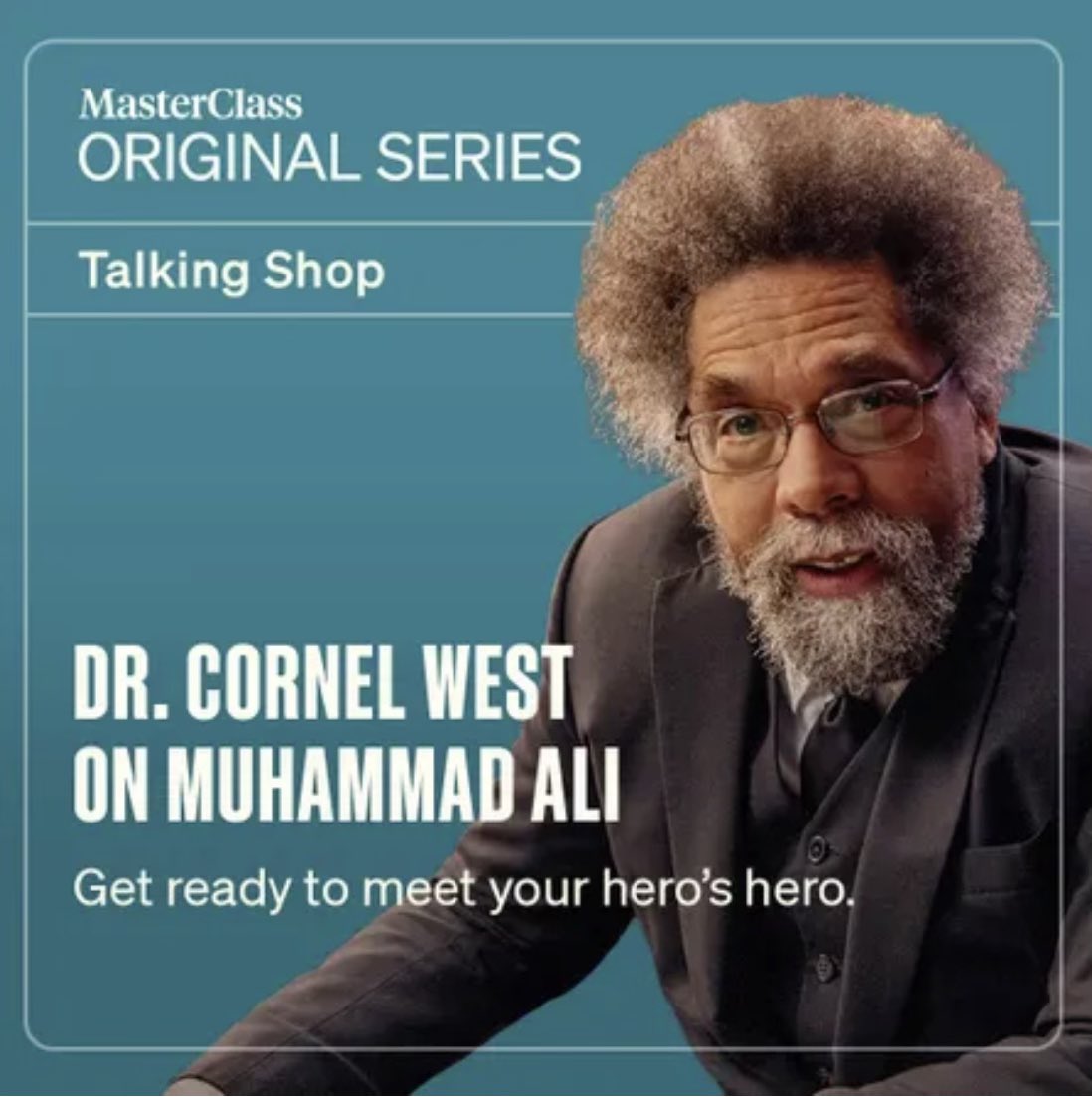 The statement is promotional in nature, advertising a MasterClass series featuring Dr. Cornel West discussing Muhammad Ali. The tone is positive and enthusiastic, aiming to generate interest in the content of the class. The statement also expresses admiration for Muhammad Ali, describing him as 'the most free and lovable man in the 20th century.' The image supports the promotional message by showcasing the speaker and the topic of the MasterClass.