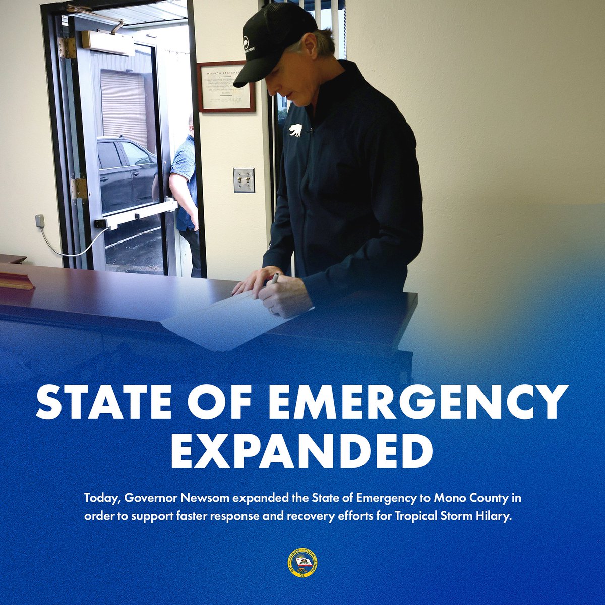 The statement is informative and factual, announcing the expansion of a State of Emergency to support response and recovery efforts in Mono County due to Tropical Storm Hilary. The image shows an individual, presumably a government official, signing a document, which visually supports the message of the statement. The tone is neutral and official, and the intent is to inform the public about government actions in response to a natural disaster.