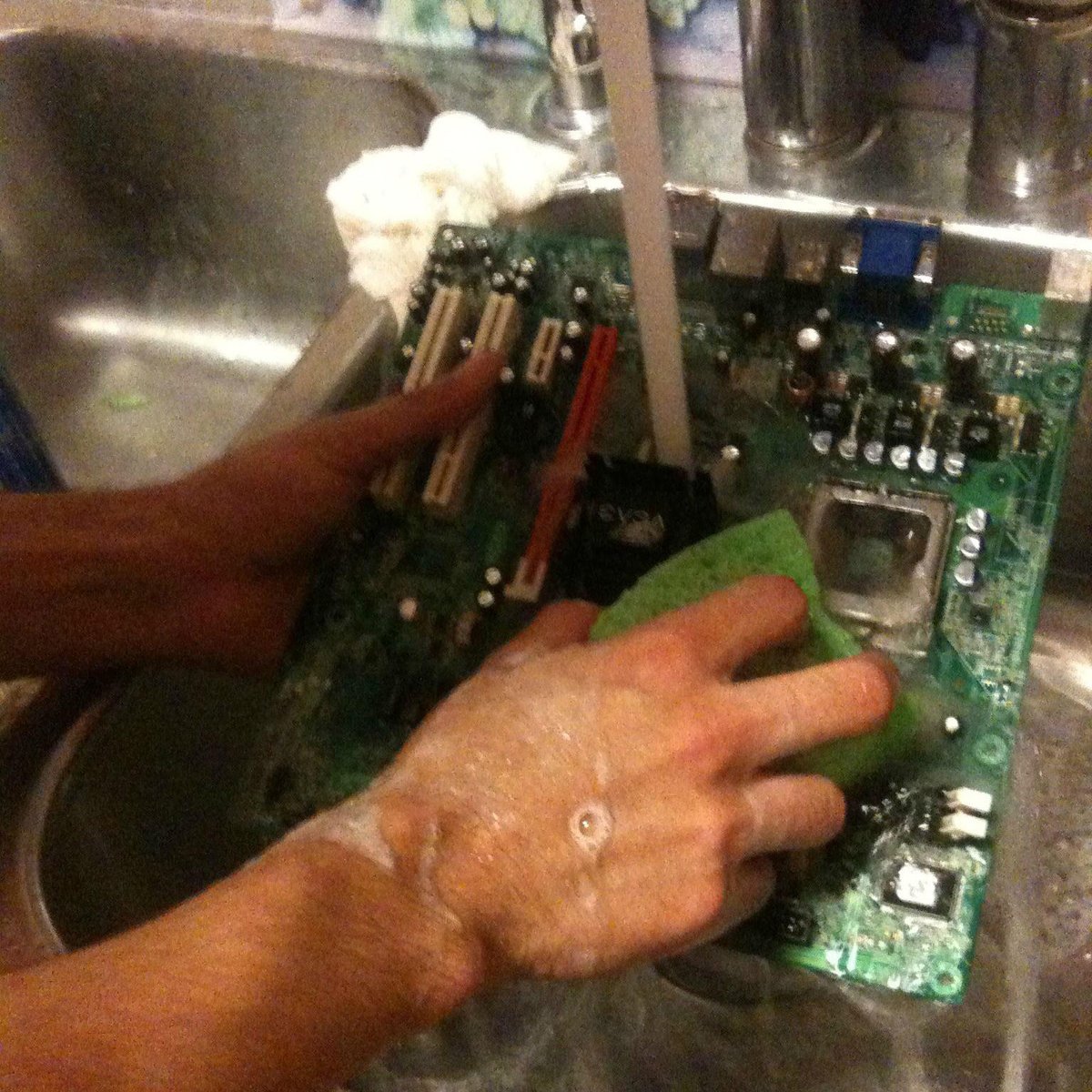 The statement is humorous and not meant to be taken literally. It plays on the idea of 'cleaning' as a metaphor for maintaining mental health while navigating the internet. The image shows a computer motherboard being washed with soap and water, which is an impractical and potentially damaging way to clean electronic components. The humor comes from the absurdity of the situation, as washing electronics in this manner would likely destroy them.