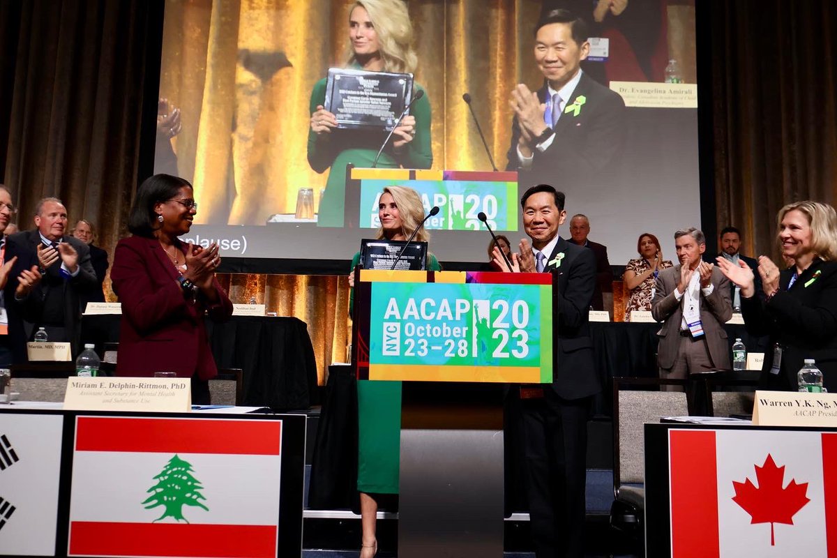 The statement is a public acknowledgment of an award received for work in supporting children's mental health. It expresses gratitude and aligns with the shared vision of the American Academy of Child & Adolescent Psychiatry. The tone is positive and appreciative. The image shows a person receiving an award in a formal setting, which corroborates the statement's content.