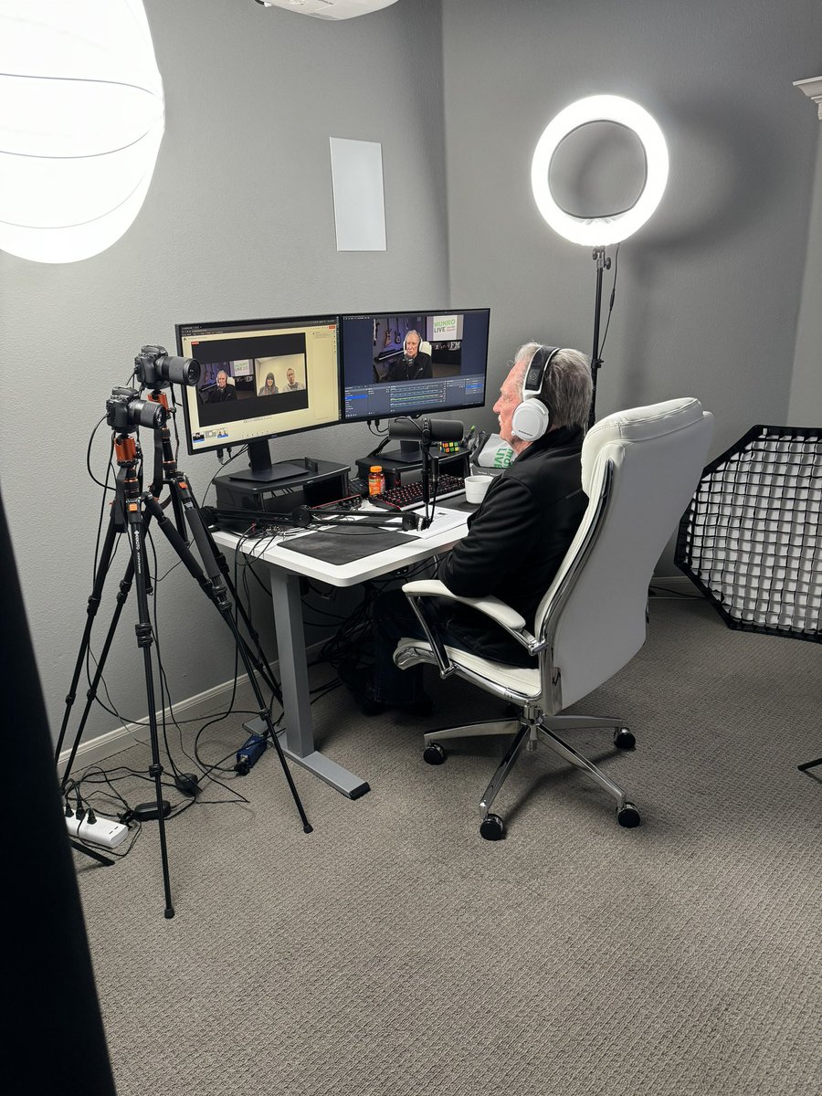 The statement '@farzyness @teardowntitan Can I come over too?' is a lighthearted request to join in on what appears to be a social or collaborative event at a studio. The tone is casual and friendly, and there is no indication of harmful intent or content. The image shows a person in a studio setting, which seems to be related to the conversation about someone using the studio space. Since the statement is conversational and does not touch on any of the principles in a significant way, the analysis can be treated as neutral.