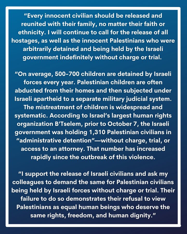 The statement calls for the release of hostages and Palestinian political prisoners, emphasizing the importance of human rights and equality regardless of ethnicity. It provides specific information about the detention of children and administrative detention practices, citing a human rights organization for credibility. The statement advocates for equal treatment and the upholding of human dignity.