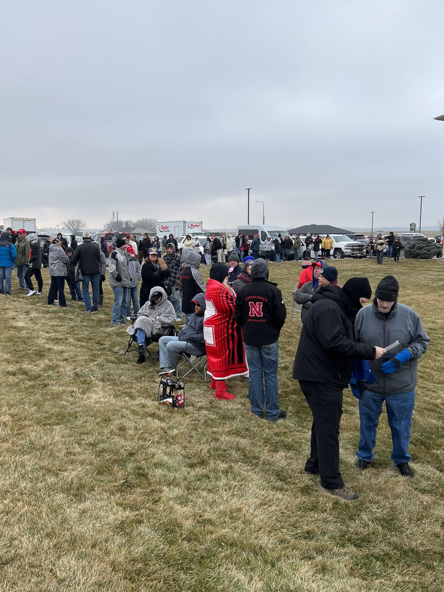 The statement is a factual description of an event where people are waiting in cold weather for a speech by a political figure. The tone is neutral and simply conveys the dedication of the attendees. The image shows a group of people gathered, presumably in cold weather, as indicated by their winter clothing. There is no indication of harm, disrespect, cyberbullying, harassment, or hate speech. The statement does not appear to promote or detract from understanding, empathy, or compassion, nor does it engage in criticism or dialogue. It does not acknowledge any mistakes, nor does it use influence for societal betterment or address free speech. It is a straightforward report of an occurrence.