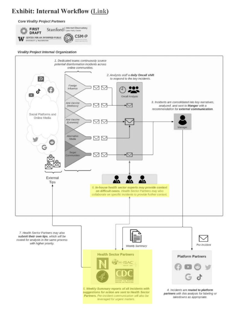 The statement appears to be a critical commentary on the involvement of federal agencies in content moderation related to Covid-19 information. The tone suggests concern or skepticism about the transparency and appropriateness of such involvement. The image provided is a workflow diagram that seems to outline the process of content moderation and the roles of various partners, including health sector partners and social media platforms.