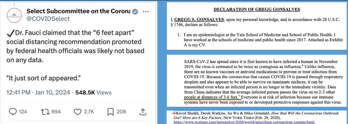The statement is a request for information clarification regarding the source of data cited in a court filing about social distancing measures. It references a tweet from a subcommittee on the coronavirus, a declaration from an epidemiologist, and a snippet from an article. The tone is inquisitive and aims to verify the accuracy of the information presented in the context of public health guidance.