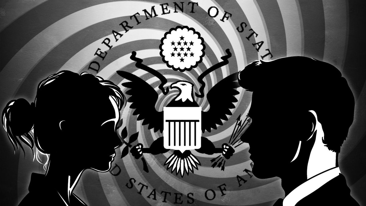 The statement presents a critical view of the Global Engagement Center's activities, suggesting that it may be blurring the lines between its official duties and engaging in prohibited domestic propaganda. The tone is investigative and somewhat accusatory, aiming to provoke thought and discussion about the role of government agencies in disseminating information. The image accompanying the statement is a stylized representation of two silhouetted figures against the backdrop of the Department of State seal, which is relevant to the content of the article and does not depict any real individuals.
