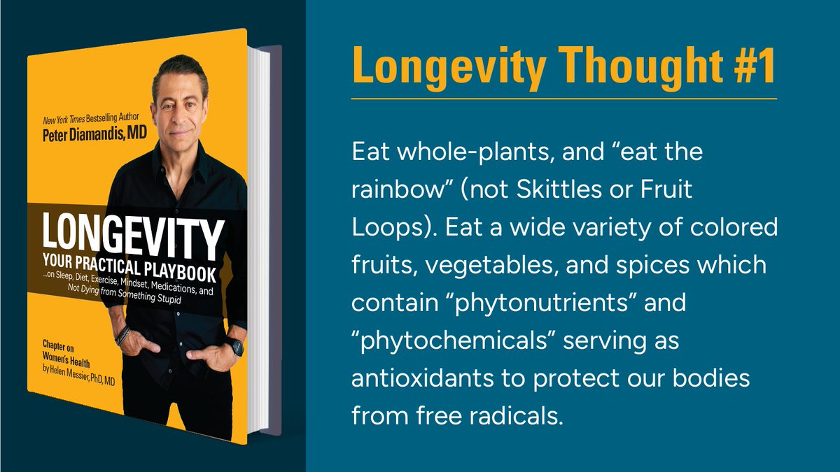 The statement promotes a healthy dietary practice by encouraging the consumption of a variety of fruits and vegetables, highlighting the nutritional benefits of different colored foods. The tone is informative and positive, aiming to educate on the importance of a diverse diet for health and longevity. The accompanying image features a book cover with a person and text that reinforces the message about eating a variety of whole plants and avoiding processed sweets for better health. The statement and image together convey a health-conscious message without any harmful or disrespectful content.
