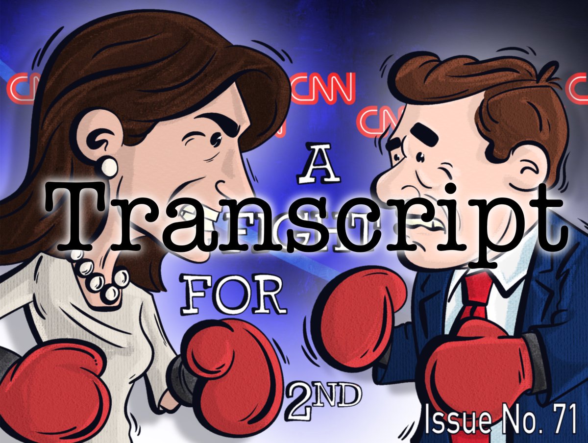 The statement from the transcript of 'America This Week, Episode 71' appears to be a satirical commentary on political events and figures, as well as a review of a piece of media, 'The Most Dangerous Game.' The use of the term 'unlikability Olympics' suggests a humorous or critical take on the politicians mentioned, likely discussing their public personas or actions in a way that could be seen as unflattering. The tone seems to be lighthearted and conversational, with an element of humor.