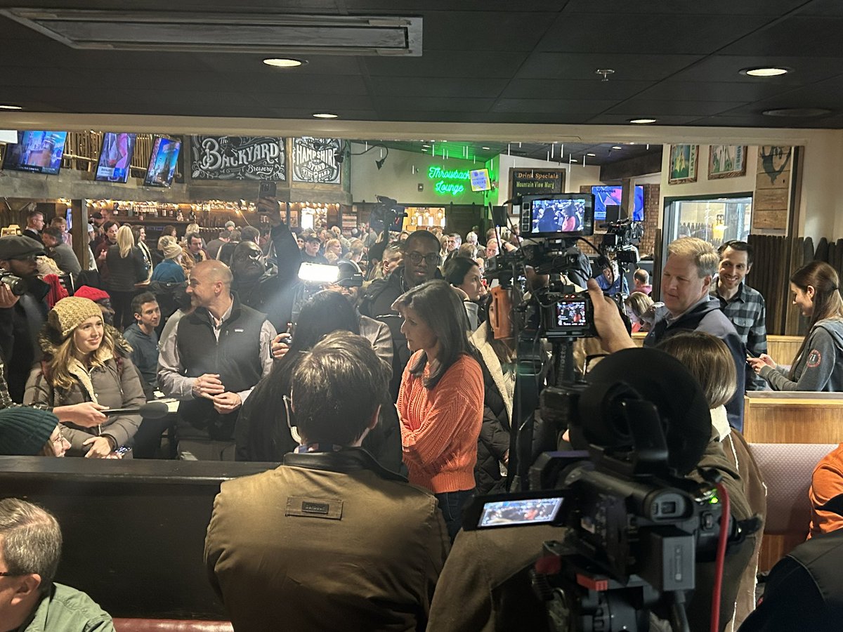 The statement is a factual report about a political event, specifically mentioning former ambassador Nikki Haley on the campaign trail in New Hampshire, accompanied by the state's governor, Chris Sununu. The tone is neutral and informative, and the content is focused on political reporting. The image provided shows a crowded event with various individuals, including media personnel, which is typical of a political campaign environment.